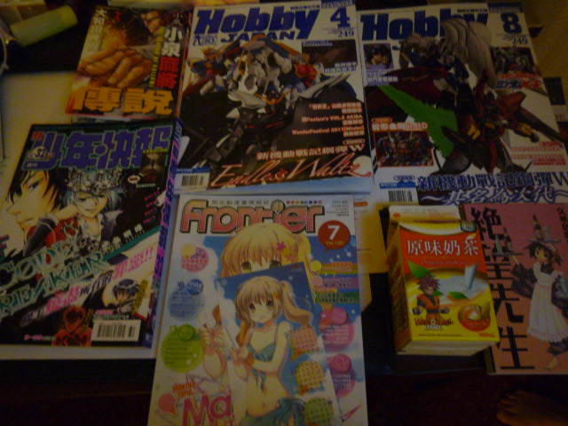 本日の収穫物 台湾 2011年07月13日 正確には、ホビージャパン2冊は妻の収穫物です。 その他はムダヅモ無き改革台湾版の「小泉麻將傳説」3巻、「絶望先生」二十四集、台湾版週刊少年マガジン「新少年快報」32号、台湾のオタ向け情報誌「Frontier」7月号、そしておまけの、ドラゴンボールオンラインの広告が入ったリプトンミルクティーです。 この他、放課後プレイ2の台湾版も発見したんですが、これはもうちょっと悩ませて下さい。明日以降、球場ラヴァーズの台湾版を捜索します。 [0回]
