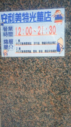 アニメイト台北光華店なう 台湾 2011年07月15日 今まで行ったことのある西門駅付近のほうではなく、2店舗めのほうです。台湾の秋葉原と言われる八徳路電気街にありました。知らずに来てビックリしてます。こっちは『らしんばん』との共同店舗になっております。妻は今東方の同人CD探しに余念がありません。店内にはミクの曲がかかっております。 もうなにがなんだか。 [0回]