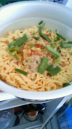 素人が携帯で撮った画像なので分かりにくくて申し訳ありませんが、それでもニンニクチップの多さがお分かりいただけると幸です。この時点で既に結構なニンニク臭がします。その他の具材はニラとキャベツです。ベジタリアンでも大丈夫仕様。