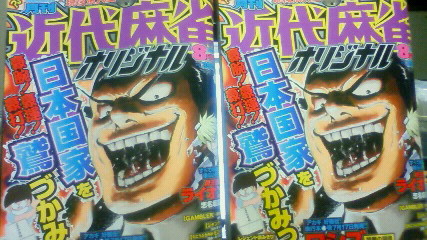 近代麻雀オリジナル 8月号 感想 麻雀漫画 2010年07月12日 表紙が素敵すぎる。そのせいか我が家にはなぜか2冊あります。 ワシズ・いきなり選挙ネタとは…ある意味時事ネタですかね。・カラー見開きで「愚民ども」最高。・「ダメですよ本音を口にしちゃあ!!」否定しろ。本音とか言うな。・「ザワザワするな貴様ら」ある意味福本漫画の全否定。・ダム建設は戦後急務の時期がありましたねぇ。電源開発も含めて。・店の看板がいい味出してますが、左から右の横書きなので戦後出来たお店ですね。・若い頃から一切変わってないな鷲巣様。・卓に置かれた牌だけが現実。名言。・徹底した実弾戦術も女装癖の前には…しかし何やってんだコイツ。・いつもながら素敵な笑顔。・移住戦術とか鷲巣様らしい。・くじ→麻雀という非常に素敵な展開。一応法律上はセーフ。・勝ったと見せかけて…カッコいいな。・そして自分も損はしない鷲巣様。それでこそ。ツカンポ!・豊臣くん33歳になったのか。・明菜ちゃん居ないのはたぶんスーパーヅガンアダルトで何かあったんだと推測しますが、読んでないので分かりません。・定員枠多いな。・「センゴチャクテン」懐かしい。・めろんちゃん、鬼ヅキ。・そして箱かぶって飛んでいく豊臣に涙。ライオン・リーチ一発ツモ大三元ってそれこそ漫画的なアガリ。でもご祝儀目当てと言うのであればまぁまだ分かる…って言っていいのかな。・カツラはズルい。笑うだろこんなもん。・借金してでも50万用立てる、か。こいつもなかなかぶっ壊れてていい。・免許持ってないのにポルシェ持ってるのは確か勝負のカタで取り上げたんでしたっけ?・ヅラじゃなくて安心しました。・狼 黒田勝。元ネタである凍牌読めば分かるんでしょうけども、読んでないのでこれが初見です。・黒田もぶっ壊れてるなぁ。破滅を賭けて戦う、とか。・リーチしても振り込み無視ですかそうですか。「いらん」じゃねーっての。・そして、黒田もツモ勝負に乗っかる。結果第1戦は黒田の勝利。鬼ヅモ無双・1回目が桶狭間だったんで2回目はどこだろうと思ったら葛尾城攻略戦とか。マイナー過ぎるだろ。2回目にして暴走決定ですか。・しかも勘助と幸隆。趣味度全開。・ヘタレなクセに麻雀強いのか長時。しかも地味に。ヤなヤツだな。・六連銭ツモはちょっと真似してみたい。カッコいい。しかも全部裏ドラとか。・そして毘沙門天の権化が降臨…次回川中島じゃないの?何というフリーダム。EZAKI むこうぶち外伝・地味に強いだけの客って、胴元からしたらうっとうしいでしょうねぇ。・「私も私の仕事をしましょう」ここの笑顔はシグルイの『笑顔は狩る時の表情』ってのを思い出しました。・江崎がチェシャ猫化しとる。ますます人気出そう。・仕掛けも仕上げも上々。そしてケレン味もある。これが江崎。・「……これだ!これが江崎だ!」ギャラリーにはなりたいが対戦相手にはなりたくない。・そしてまさかのオチ。案外と世の中うまくいかないもんだ。・「いいんじゃないでしょうか?」「たまには」真意はどこにあるのやら。この直後に打つことになった相手は災難だったでしょうね。 [0回]