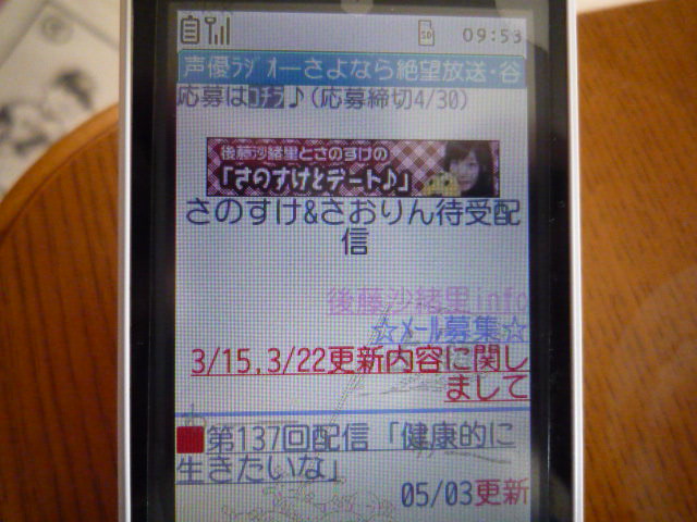 後藤沙緒里のいろはにほへと第137回配信「健康的に生きたいな」感想 いろはにほへと 2011年05月03日 ・すいません。祝日だったので油断して気づくの遅れました。・あと、ずっと私の携帯↓みたいな画面なんですが、上の帯のところ、何でいろはにほへとなのに「さよなら絶望放送」の文字が出るんでしょうね。・「最初っからちょっとカミカミだよ」カミカミさおりんは私にはご褒美です。・「ゴールデンウィーク真っ最中」しかも3、4と妻がイベントに行っているので完全自由時間です。ひゃっほう!と思って大阪ドームに野球を見に行ったら完売で入れませんでした。・「頑張れば10連休」2と6を休みにしてる人は私の職場にもおりますなぁ。・自由業は不自由業。・「10連休もあったらどうします?」「金に糸目を付けずに、何がしたい?」台湾に行きたいですね。もしくは国内ではひたすらマリーンズの観戦を。・「そんなに休んでしまったら元の生活に戻れない」私、社会人になってから最大で8連休と言うのをいただきましたが、ちゃんと戻れました。割と大丈夫なもんです。それとも8は大丈夫でも10はダメなのかも。・「何がしたいですか?」「寝たい」10日間も?・「あたしなら…」「人間綺麗にしなくちゃいけないんだと思って」「健康に気をつかわねばいけんのだ、とこの歳にして思い始めて」「ご飯とかも食べなくちゃいけない、とか、身体を動かさなきゃいけない、とか」耳と心に激痛が。・「マッサージとか1日中受けたい」私、マッサージは多少心得がございますので、妙な下心抜きでやって差し上げたい。足湯とかもしますよ!・「綺麗になりたい週間を」既にこんなに素晴らしい状態のさおりんをしてこの発想。私も反省して断食道場に行くべきか。・「目の前の女子もうなずいて」「さっき寝たいとか言ってたクセに!」言われると影響されるんじゃないですかね。・「ペンネーム:ニューバレーグッドチャイルドさん」「僕は、1年間一緒に居るクラブの後輩の女子と2人きりになると、会話が出来ません」割と重めのカミングアウト?いや、そうでもないか。・「さおりんは、初対面の人とはどう接しますか?」字面だけ見てると分かりづらいですけど、絶妙なニュアンスの話題のつなげ方ですね。・「1年間一緒にいる方と2人きりになると会話が出来ない」「あるとおもいます」あるあるあるある。・「メールの横っちょにメモ書きするようにしてるんですけど」「一番上のところに『なぜ頑張る』って書いてある」さおりんの頼もしいお言葉。…ちょっとクスッとしてしまったのはナイショです。・「そうやって頑張ってるのが私も分かってしまうので」「ごめんなさいって思うので」「なんか、私できないですね」「難しいから」「私、無理しないように生きてるので。そういうところでも」「基本的なあいさつが出来ればいいんじゃないかな」無理はよくないですよね。ええ。・「私、第一印象が最悪らしいんですよ」きっと警戒心や恐怖心が出ちゃうんでしょうね。さおりん小動物説って、こうやって定期的に証明されてる気がします。・「本当に」「本当なんですよ」「極力笑顔ではいようかなって、やっと最近思いました」さおりんなら笑顔ひとつで全部解決できる気がする。・「1年間も一緒にいるんだから、なにかきっかけで一気に距離が縮まるっていう事もあると思うので」「大丈夫、時が解決するよ」「また1年経ったりしてね」「ごめんね、解決になんなくって」しかし、メールを読み返してみると、あまり解決は要求していないようにも読めます。「ペンネーム:牛タンうめぇさん」「花粉症を気にしないことに決めたよ、とおっしゃる沙緒里さんにスタッフさん、ふところポイントを……あれいま募集してないんですかそうですか」これお見事でした。素晴らしい発想力。・「この番組を通して沙緒里さんのふところはすごく拡大したと思います」同意同意。・花粉症がゴールデンウィーク前後におさまるのは杉花粉の場合のようで、別の花粉の場合はちょっと時期がズレるので2種類以上の花粉にやられてる人は大変みたいです。・「あたし?気にしてないよ」「ぴろりろりん」「貯まった!貯まったよ!」「何かあるのかな」「地味に貯めていきましょうか」そうしましょうそうしましょう。・「この調子で地味にふところポイントを貯めていきたいと思います」なんかまた良い賞品がもらえるといいですね。 [1回]